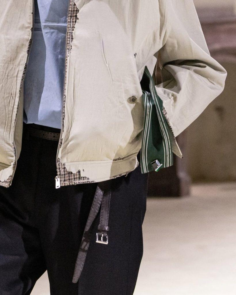 Accanto, una giacca di pelle sembra essere stata buttata su una superficie in legno. Le numerose spille che la decorano raccontano il passare del tempo, i viaggi compiuti, i ricordi accumulati. Sul pavimento, scarpe sparse disegnano un percorso sinuoso. Un modo per il designer di rappresentare le molteplici sfaccettature dell’uomo immaginato in questa stagione e, più in generale, all’interno di uno dei marchi di punta del gruppo LVMH.
